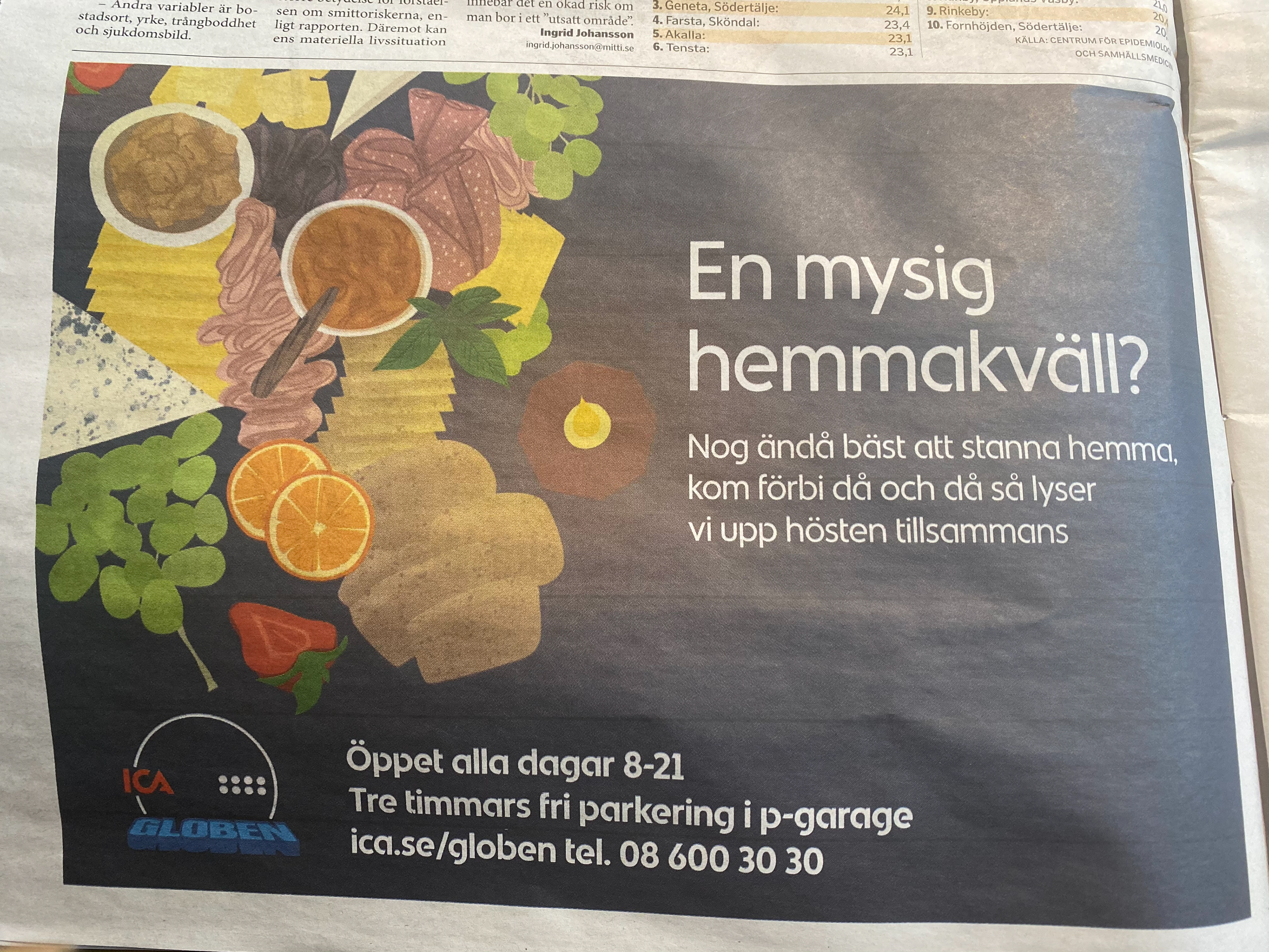 Ica Globen wanted to create content that inspires their customers to have a cozy night at home, what Swedes call a "hemmakväll". This was to be done by videos on on the tv-screens in the supermarket, a social media ad and a half page ad in the local newspaper. After a brainstorm session with Carin, we decided that these videos should be illustration focused, and work as a kind of animated posters.